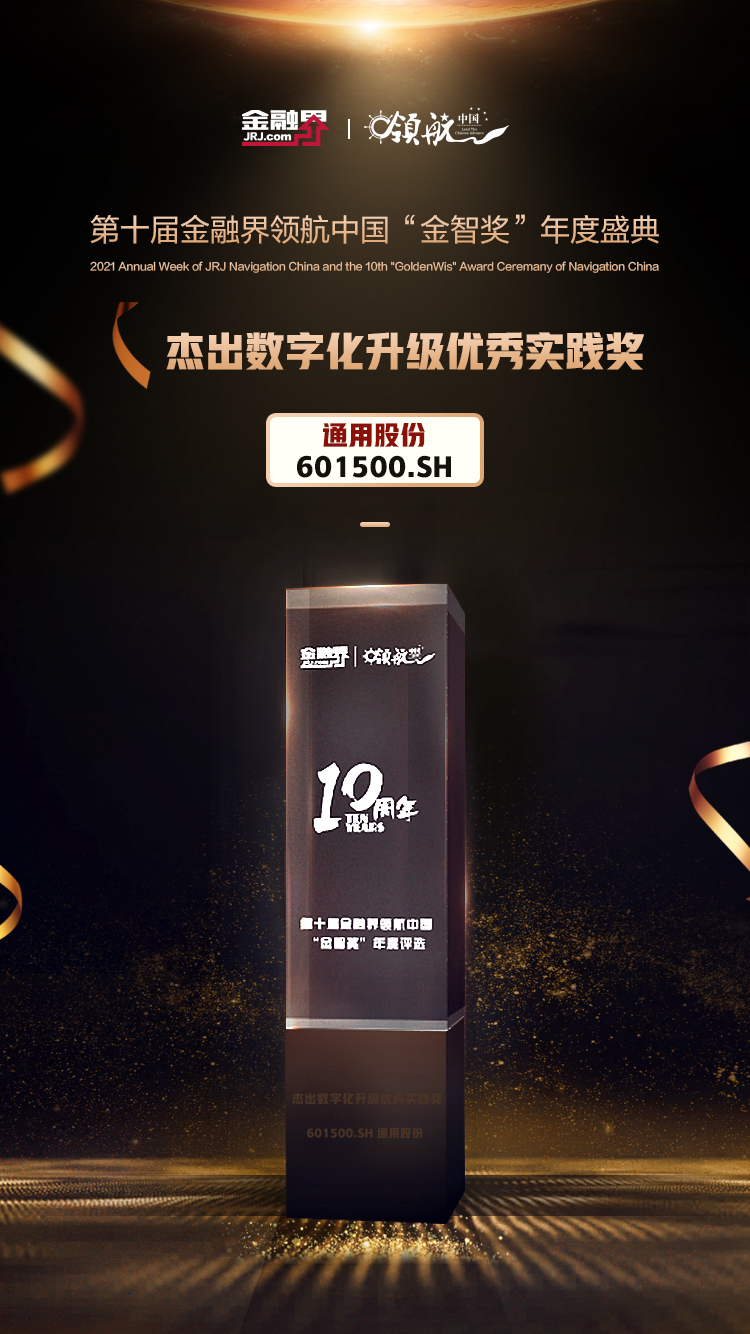 通用股份榮獲2021領(lǐng)航中國杰出數(shù)字化升級優(yōu)秀實(shí)踐獎(jiǎng) 12月24日,在由金融界舉辦的2021第十屆領(lǐng)航中國金智獎(jiǎng)年度盛典頒獎(jiǎng)典禮上,通用股