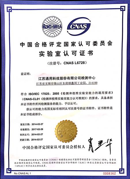 2014年2月27日,中國(guó)合格評(píng)定國(guó)家認(rèn)可委員會(huì)(CNAS)正式授予江蘇通用科技股份有限公司檢測(cè)中心國(guó)家實(shí)驗(yàn)室認(rèn)可資質(zhì),認(rèn)可證書編號(hào):L6728。