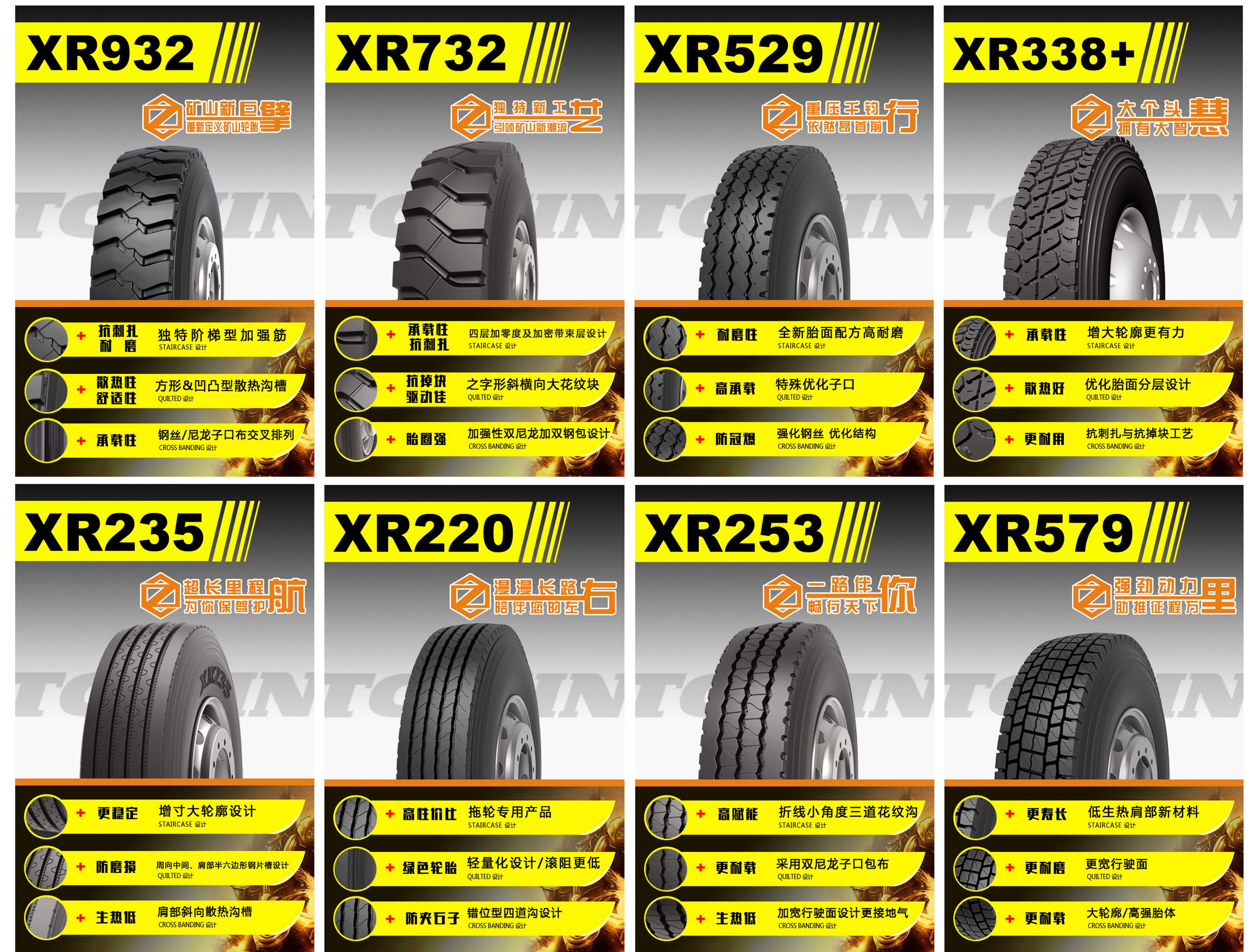 XR932具備獨特的階梯型加強筋設計,輪胎更抗刺扎、更耐磨,使用壽命更長,方形&凹凸型散熱溝槽,有效增強輪胎散熱性、舒適性,通過優(yōu)化鋼絲/尼龍子口布交叉排列,使輪胎具有卓越的承載性能。