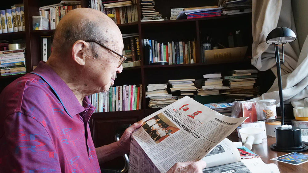 7月29日,今年的七夕前夕,當(dāng)代著名老詩人、作家、文藝評(píng)論家丁芒在家中認(rèn)真錄制著對(duì)紅豆七夕節(jié)20周年的祝福視頻。中國當(dāng)代詩壇曾有“北臧南丁”之說。丁芒,這位從南通城走出來的大詩人,從抗日戰(zhàn)爭的烽火開始生命的吟唱,80載筆墨為伴,書寫了萬余首激蕩人心的詩篇。面對(duì)記者的拜訪,丁芒和其夫人都十分熱情?,F(xiàn)已96歲高齡的他,看起來依舊面色紅潤,精神飽滿。在丁芒老先生家中,能夠感受到濃濃的文化氣息,書柜上、書桌上擺滿了各種書籍。雖然已是耄耋之年,丁芒老先生依然每天以書籍為精神食糧,在他的身上,我們看到了一個(gè)詩人對(duì)詩詞的忠貞和熱愛,對(duì)傳統(tǒng)文化的敬畏和崇拜。