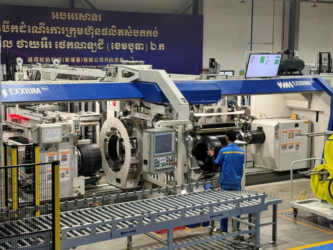 走進通用輪胎科技(柬埔寨)有限公司,目之所及都是智能化的生產設備,工廠內建有13個立體智能倉庫,91個機器人。令人驚嘆的是,從半部件到一條20寸的輪胎成型,僅需33秒的時間就完成了。該工廠自2023年5月正式開業(yè)以來,以打造智能化、自動化、信息化的現代化工廠為目標,推進智能制造和精益制造,僅一年時間,一期項目就實現了全面達產。如今,正在加快推進二期項目建設,一期、二期全部達產后,將具備年產850萬條半鋼子午胎和165萬條全鋼子午胎的生產能力。